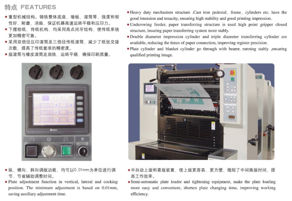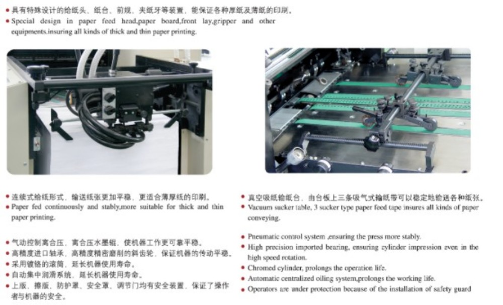 Den stora offsettryckpressen för stora A3 fyrfärgsetiketter är designad med högpresterande moduler, och de är alla av högsta kvalitet - högprecisionsrullar och -växlar, en stark pappersmatningsmekanism, ett högprecisionsregistreringssystem för papper och ett stabilt bläckförsörjningssystem. Den är skräddarsydd för att möta marknadens krav på färgutskrifter av skärblad som är högkvalitativa, effektiva och prisvärda. Du behöver inte hålla dig till bara en papperstjocklek heller – det fungerar med tunt papper (0,04 mm) upp till tjock kartong (0,4 mm). Det finns också en pekskärmskontroll med ett intuitivt programmeringsgränssnitt, som låter dig justera inställningar och utskriftsparametrar på ett smart och enkelt sätt.