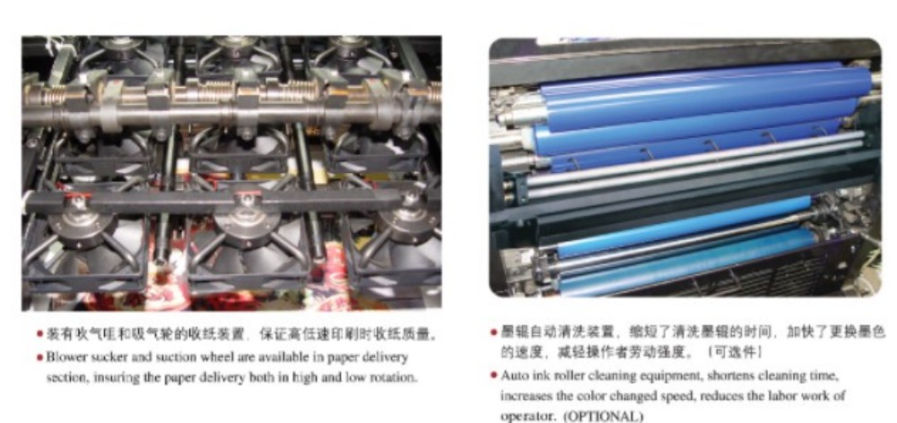 Den stora A3 fyrfärgade offsettryckpressen för förpackningstryck är designad med högpresterande moduler, och de är alla av högsta kvalitet – högprecisionsrullar och kugghjul, en stark pappersmatningsmekanism, ett högprecisionspappersregistreringssystem och ett stabilt bläckförsörjningssystem. Den är skräddarsydd för att möta marknadens krav på färgutskrifter av skärblad som är högkvalitativa, effektiva och prisvärda. Du behöver inte hålla dig till bara en papperstjocklek heller – det fungerar med tunt papper (0,04 mm) upp till tjock kartong (0,4 mm). Det finns också en pekskärmskontroll med ett intuitivt programmeringsgränssnitt, som låter dig justera inställningar och utskriftsparametrar på ett smart och enkelt sätt.