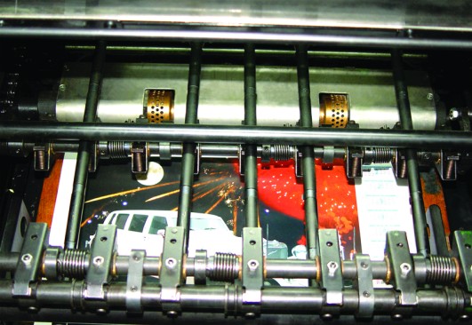 3. Pressen har en kontinuerlig pappersmatningsmodul ansluten till ett vakuumsugbord på vilket tre roterande papperstransportband är installerade. Ett sådant papperstransportsystem kan på ett tillförlitligt sätt transportera olika typer av papper med bred tjocklek.